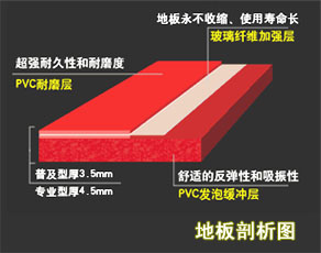 ⒈ 本產(chǎn)品由PVC耐磨層、玻璃纖維加強層和PVC發(fā)泡緩沖層組成。