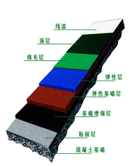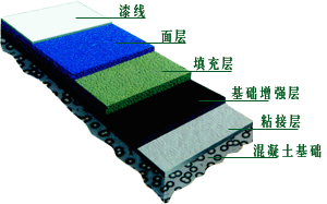 4、面層:由色彩鮮艷、抗紫外光的丙烯酸涂料鋪成增加耐磨性。